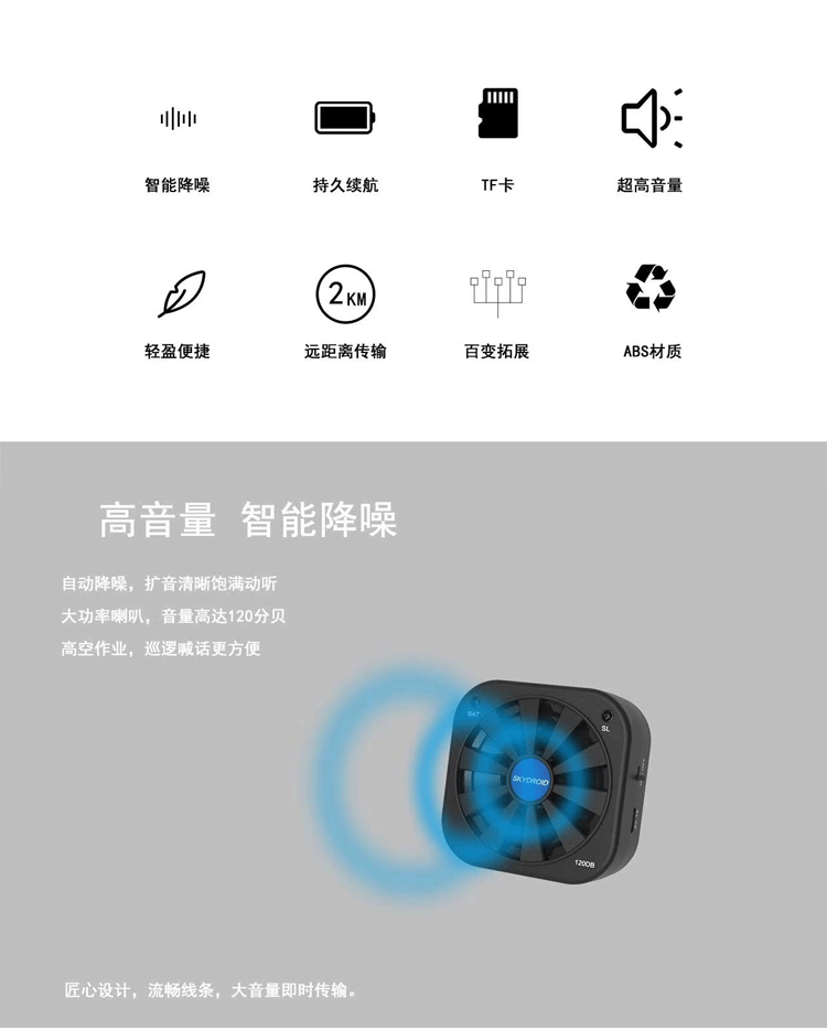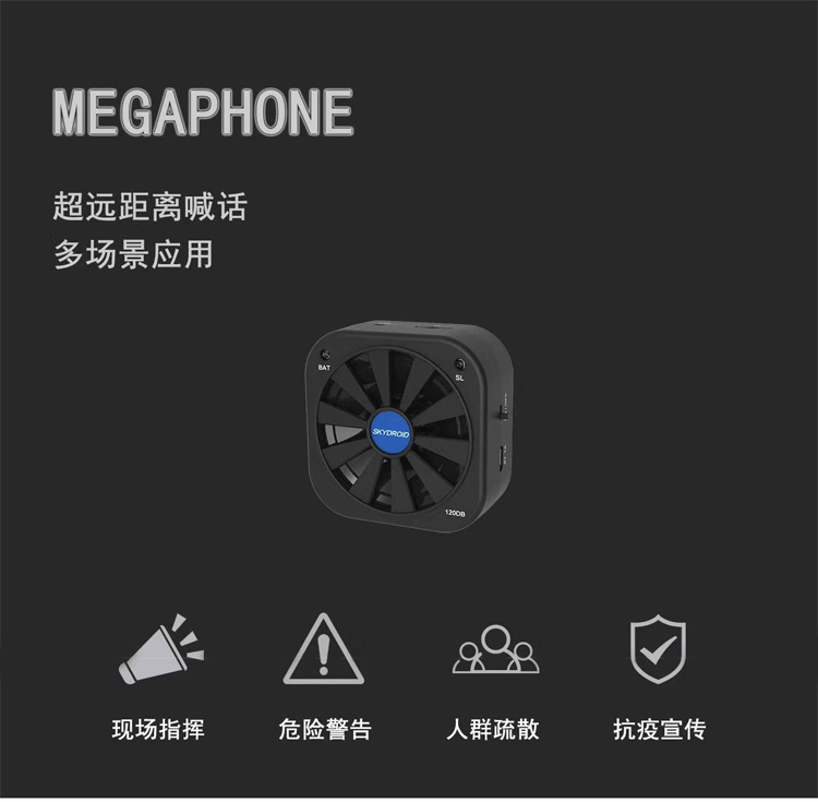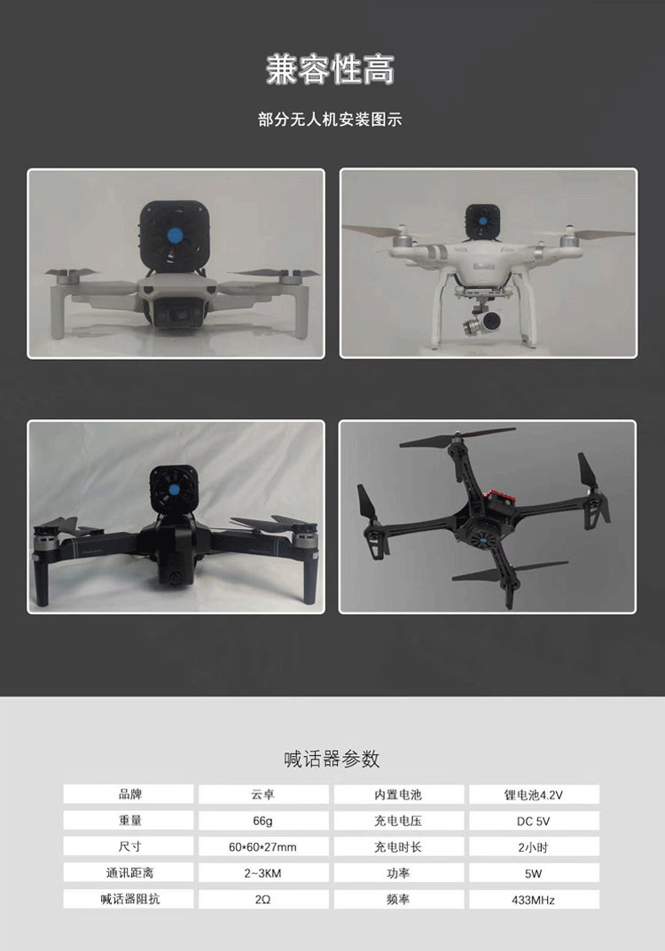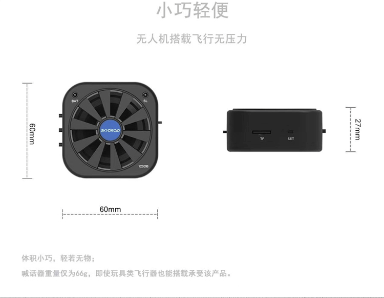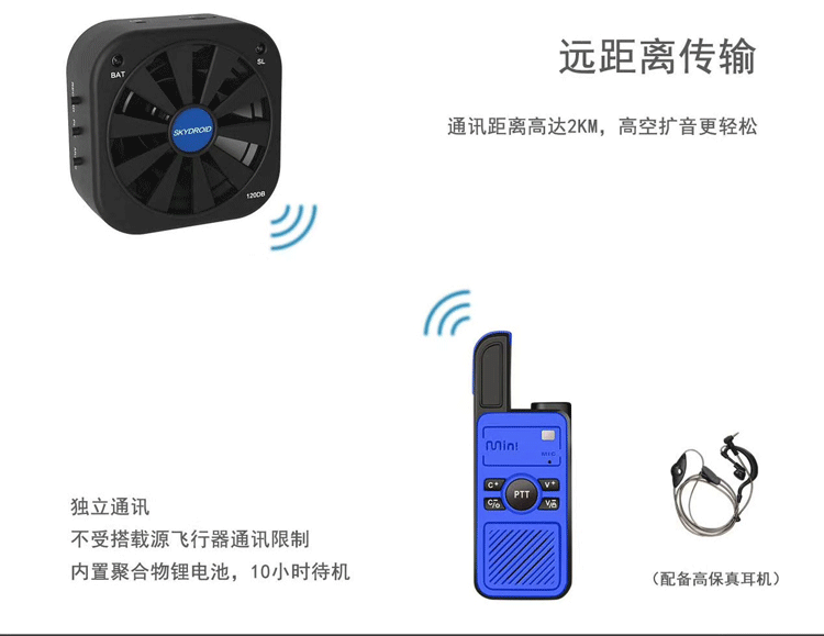 HF無人機對講喊話器系華飛航空科技自主研發(fā)、生產(chǎn)。該喊話器具有通話傳輸距離遠(yuǎn),空中端聲音清晰無嘯叫、無失真,音量也比普通喊話器提高了近一倍。該喊話器除具備喊話、對講基礎(chǔ)功能外,又增加了可空中播放多種警示音及(通知、通告)音頻文件。通過電腦將文字資料轉(zhuǎn)換為音頻文件拷貝至喊話器數(shù)字處理模塊,即可實時播放,可中英文播放。 開關(guān)切換在喊話器一側(cè)(切換對講機或警笛聲)。 特別適合于旅游景點、公共場所、應(yīng)急救援等